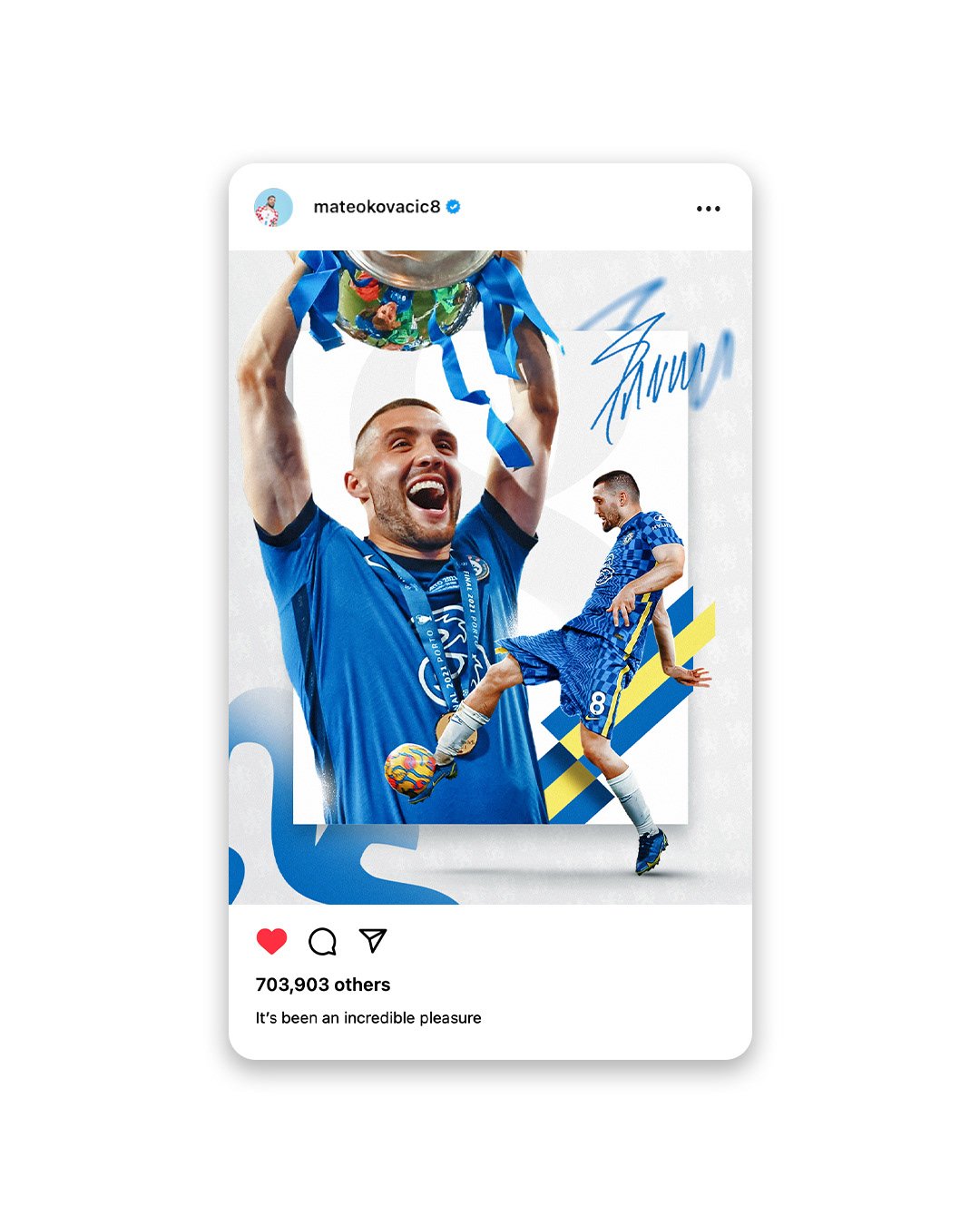 In order to commemorate Mateo Kovacic's tenure at Chelsea and mark his big move to Manchester City, I was tasked in creating a farewell graphic for his social media. My approach was centered around capturing Kovacic's essence as a player, emphasising minimalistic elements like incorporating Chelsea badges as a pattern and subtle hints of blue to make the player cutouts pop against the white background. The selected imagery highlighted pivotal moments from Kovacic's Chelsea career, including his triumph in the Champions League and his wonder goal against Liverpool.